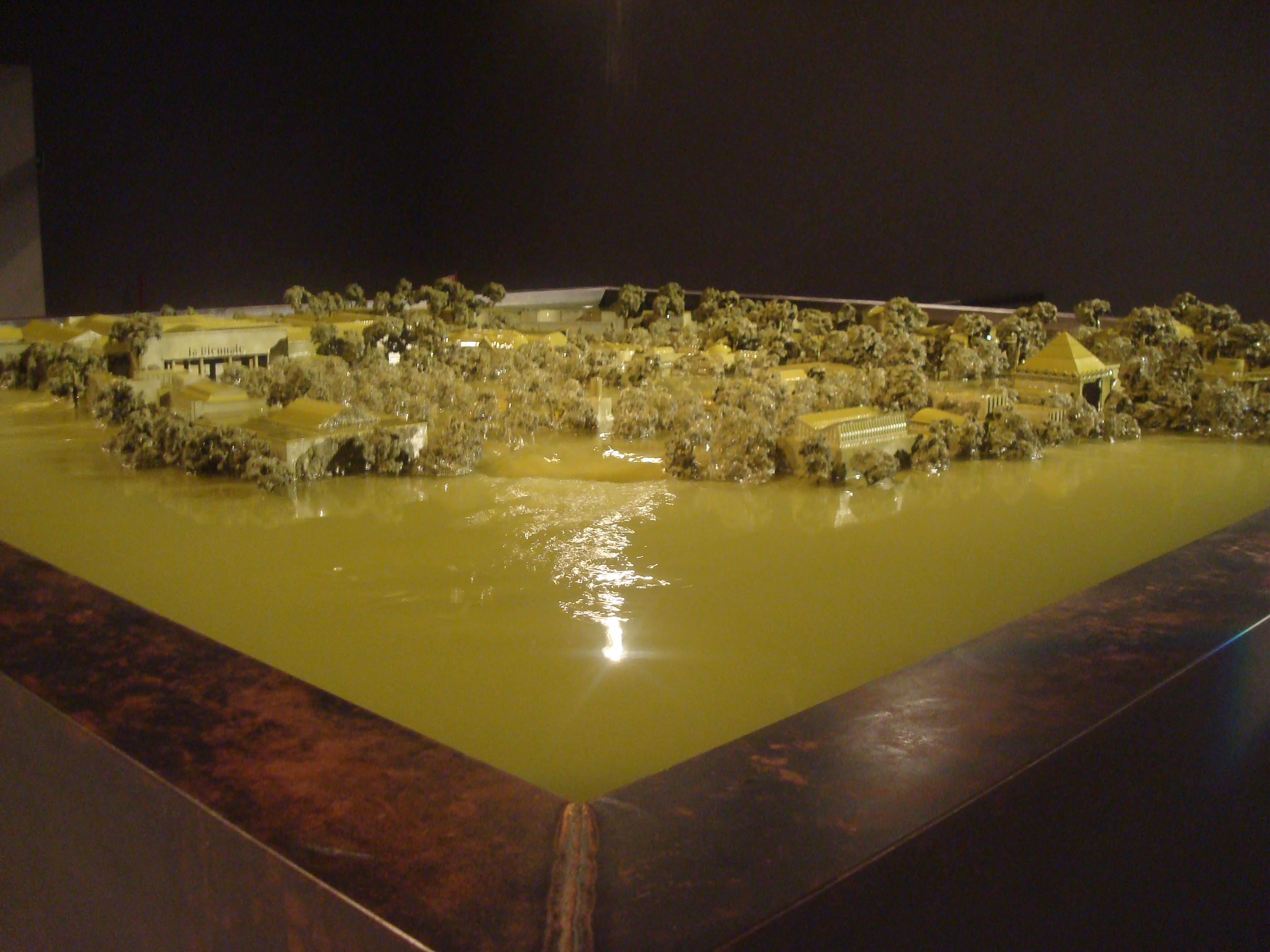 Ett av Venedigbiennalens mest omskrivna och fotograferade verk är utan tvekan Alfredo Jarr´s stora modell av Giardini, parken och paviljongerna som han låter sjunka ned i ett brunt vatten och sedan återvända ur den murriga avloppssörjan. Visst är det fascinerande att ta del av detta i staden som alla profetior dömt till att långsamt sjunka ned i den adriatiska lagunen. Men verket har en annan udd, det blir en symbolisk bild av den ”gamla” ekonomin där världens stora nationer tävlade med konst, byggde monumentala palats för att visa den ”godkända” konsten.