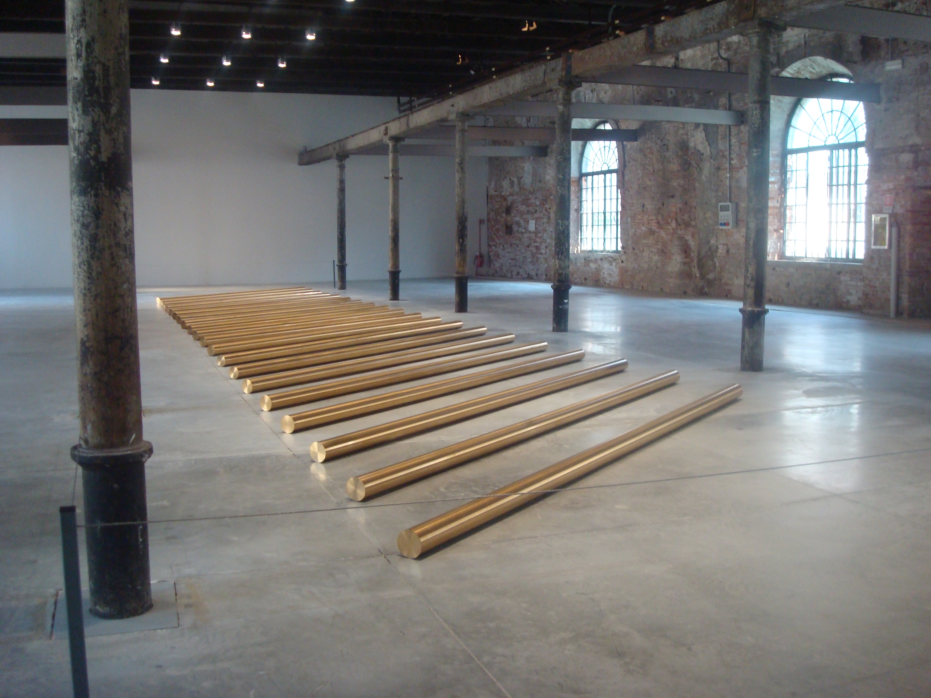 Inte underligt att många kritiker reflekterat över kontrasten mot allt detta, en av de gamla hallarna i arsenalen där teglet, stålbalkarna och betonggolvet framhäver skönheten i Walter de Marias skulpturverk Apollo’s Ecstasy där tjugo bronsstänger placerats ut i en perfekt symmetrisk form och glöder av harmoni. Överväldigande och vackert !