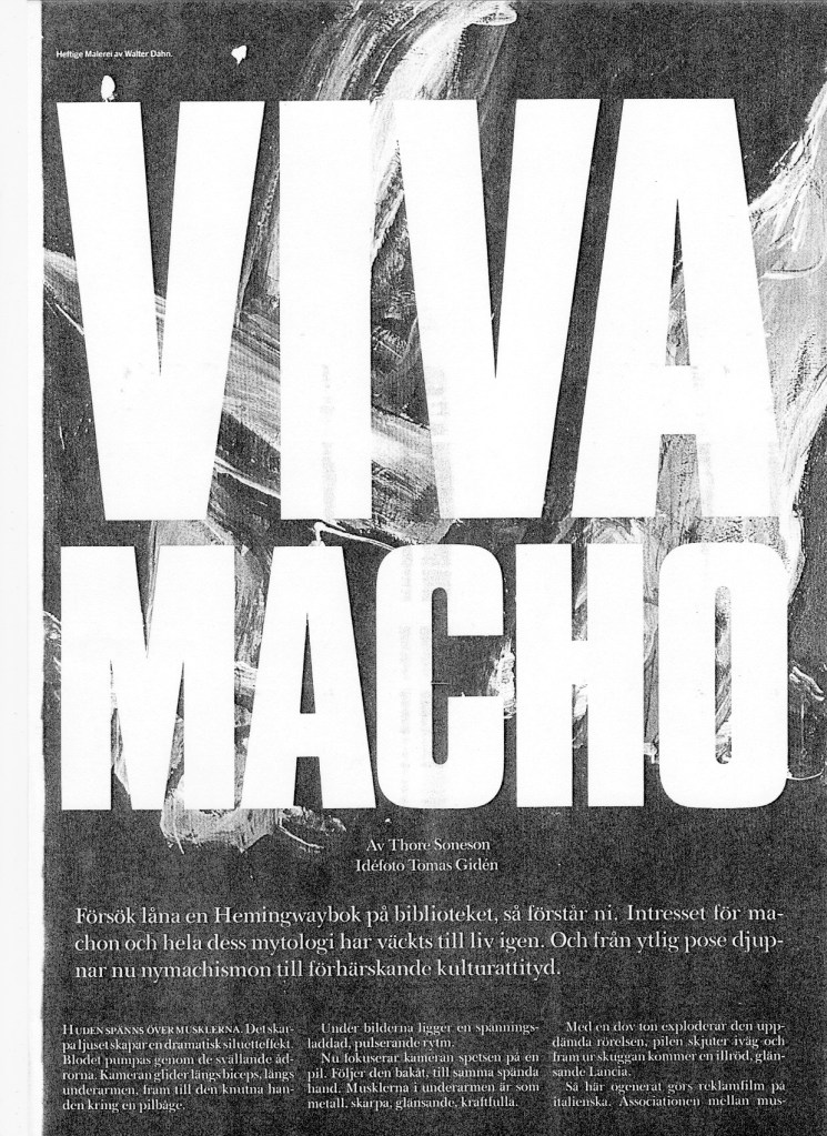Under de åren var jag aktiv som journalist, från rocktidningen Schlager, via Dagens Nyheter och till frilansande skribent i ett antal magazin som med dagens terminologi skulle kallas livsstils publikationer. Tidningen ABCD var ett av dem med bred kulturell profil, med fokus på mode och stil men med en vilja att kombinera Vanity Fair med The Face på svenska. Jag skrev en del essäistiska artiklar i den publikationen, bland dem ”Viva Macho” i premiärnumret. Kongenialt illustrerad av fotografen Tomas Giden (ursäkta den risiga svartvita kopian i pdf-filen…)