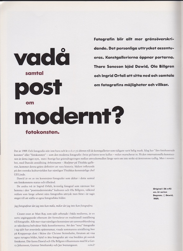 Dawid är en av tre konstnärer/fotografer som deltar i detta samtal om fotokonstens status och tillstånd. De andra två är Ingrid Orfali, kvinnlig fotograf som närmast hör hemma i den ”postmodernistiska” kulturen och Ola Billgren, välkänd konstnär som länge arbetet nära fotografins uttryck men först i år tagit steget till att ställa ut egna fotografiska bilder.