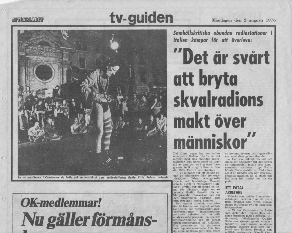 – Vi har Canzionere de Latio som spelar den ursprungliga sardiska musiken med elektriska instrument, folksångarna Quatro Stato som sjunger gamla arbetarsånger till egen musik, moderna politiska sångare med eget material som Eduardo Bennato och politisk rockmusik, Napoli Centrale. Vi presenterar artisterna grundligt, låter dem själva berätta om sin musik. Gemensamt för dem alla är att de ytterst sällan blir spelade i RAI. De behöver sprida sin musik.