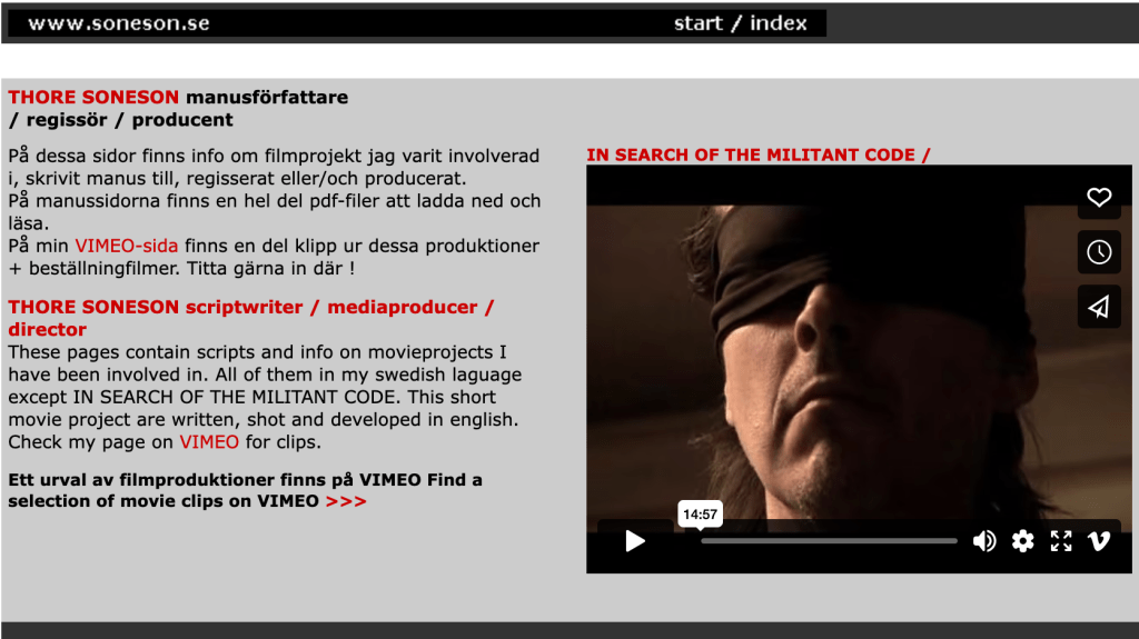 Jag har ägnat stor del av mitt yrkesverksamma liv åt att skriva – främst som journalist och manusförfattare, som producent och filmmakare. Har publicerat en hel del manus och filmiska projekt på min hemsida. Flera av dessa har inte nått hela vägen till att produceras – som tv-serien Bernard Foys Tredje Rockad eller thrillern Nemesis.