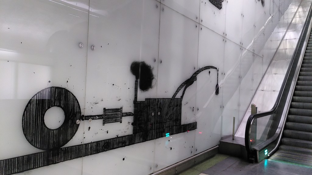 I Stockholm är det de permanenta verken som gör störst intryck, den relativt nya Citybanan invigd 2017 djupt under de äldre T-banorna strålar ut från T-Centralen och där finns många verk värda att stanna upp och reflektera över. Vi åker ned i rulltrappan på Odenplan där Anders Kappel skapat verket ”Itinerary” som består av 38 kolteckningar på laminerat glas. Det är grafiska konstruktioner och maskindelar som blir ett slags tecken för vår civilisation, fascinerande att studera.