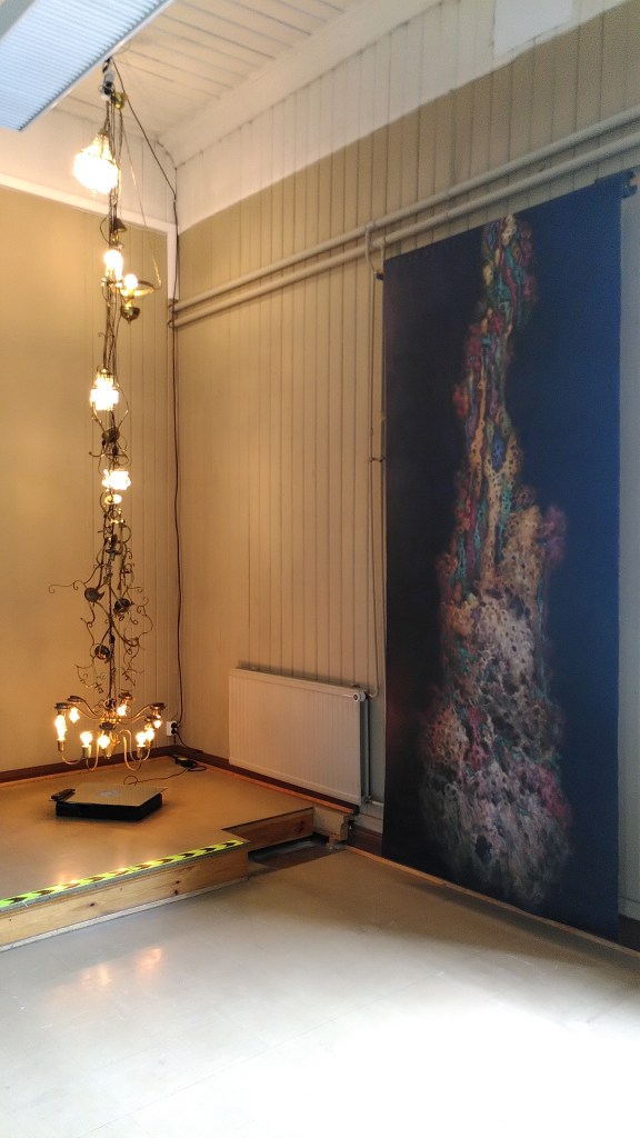 Och det syns i stadens gemensamma rum. I ett köpcenter hänger stora tusch teckningar med vildsint energiska budskap av gruppen som kallar sig ”Drawing Theater” där Triennalens konstnärlige ledare Petri Hytönen deltar tillsammans med bla Kalle Turakka Purhonen.