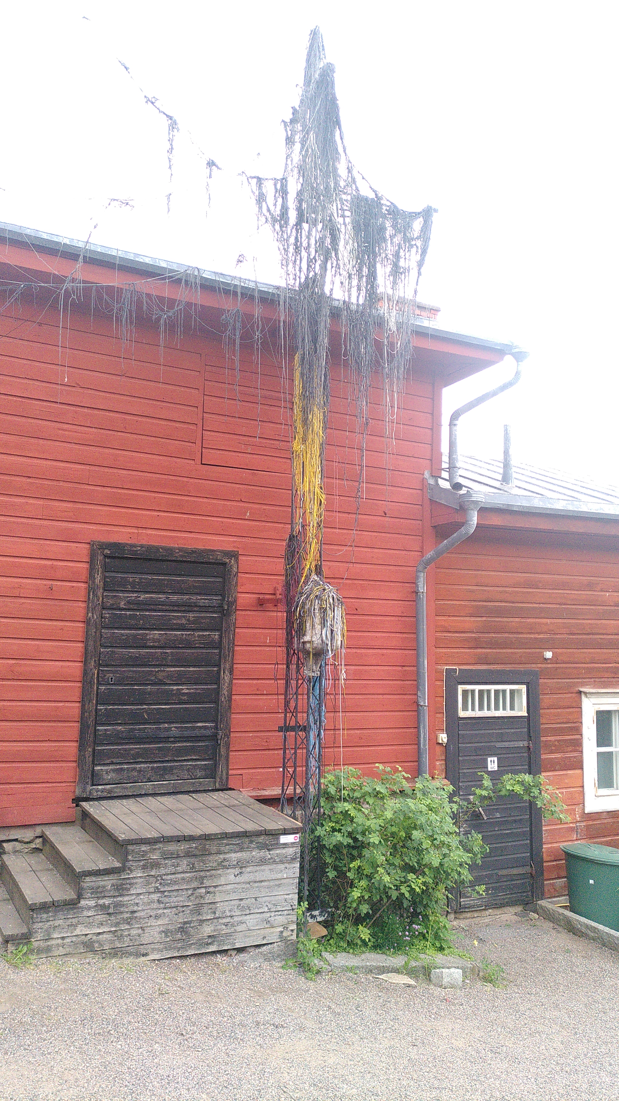 Utanför reser sig en mast med ett svart nystan av silikontrådar av Roland Persson mot himlen som en havererad kommunikationsstolpe.