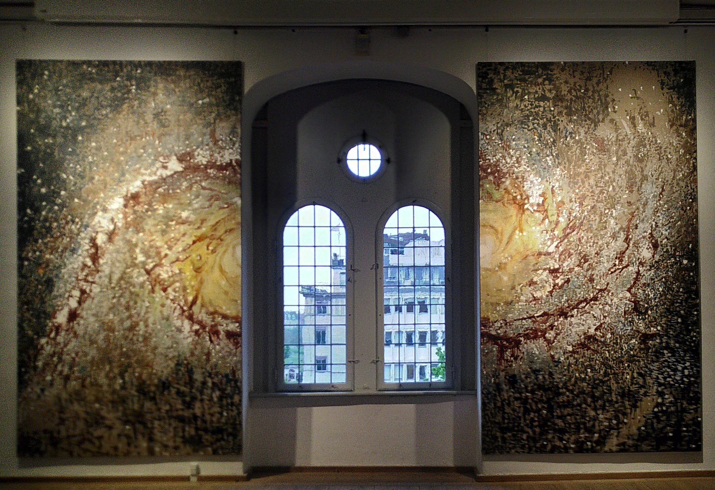 ”Vi tillhör världen. Världen tillhör inte oss. Detta är utgångspunkten för utställningen TIME*DUST*STARS, som kretsar kring mänsklig påverkan på planeten.” Så presenteras den mångfacetterade utställningen av åtta danska konstnärer i det spaciösa biblioteket i Rundetaarn, den runda tegeltornet som är en turistmagnet i centrala Köpenhamn. Det är skiftande tekniker, från ett grandiost måleri av en galax till ett framtidscafe på Mars där väggarna fylls av glättigt turistiska bilder från den ”goda” planeten. Många lager av förståelse och upplevelser med fokus på vad vi riskerar att förstöra och förgifta av naturens krafter.