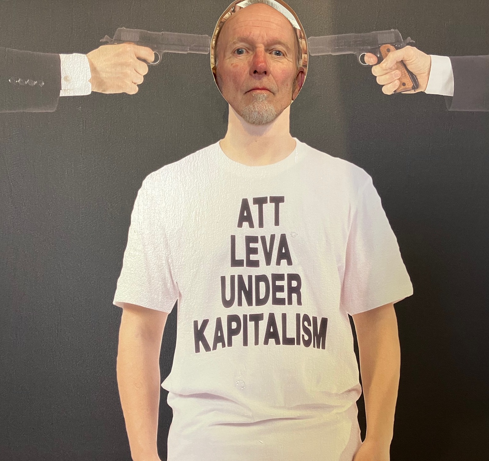 Under årets Konstrunda sökte jag upp Ola Åstrand som i sin atelje/lada iscensatt en installation där han speglat samtidens konsumism och energislukande samhälle med en kritisk och skarp blick. Hans lek med klassiska cirkuskonster där vi uppmanas att sätta in vårt ansikte i en annan kropp och attackeras av en våldsam ekonomisk ordning är en självklar politisk handling. ”Politisk plakatkonst” kallar han själv verket och sin installation i en intervju inför utställningen.